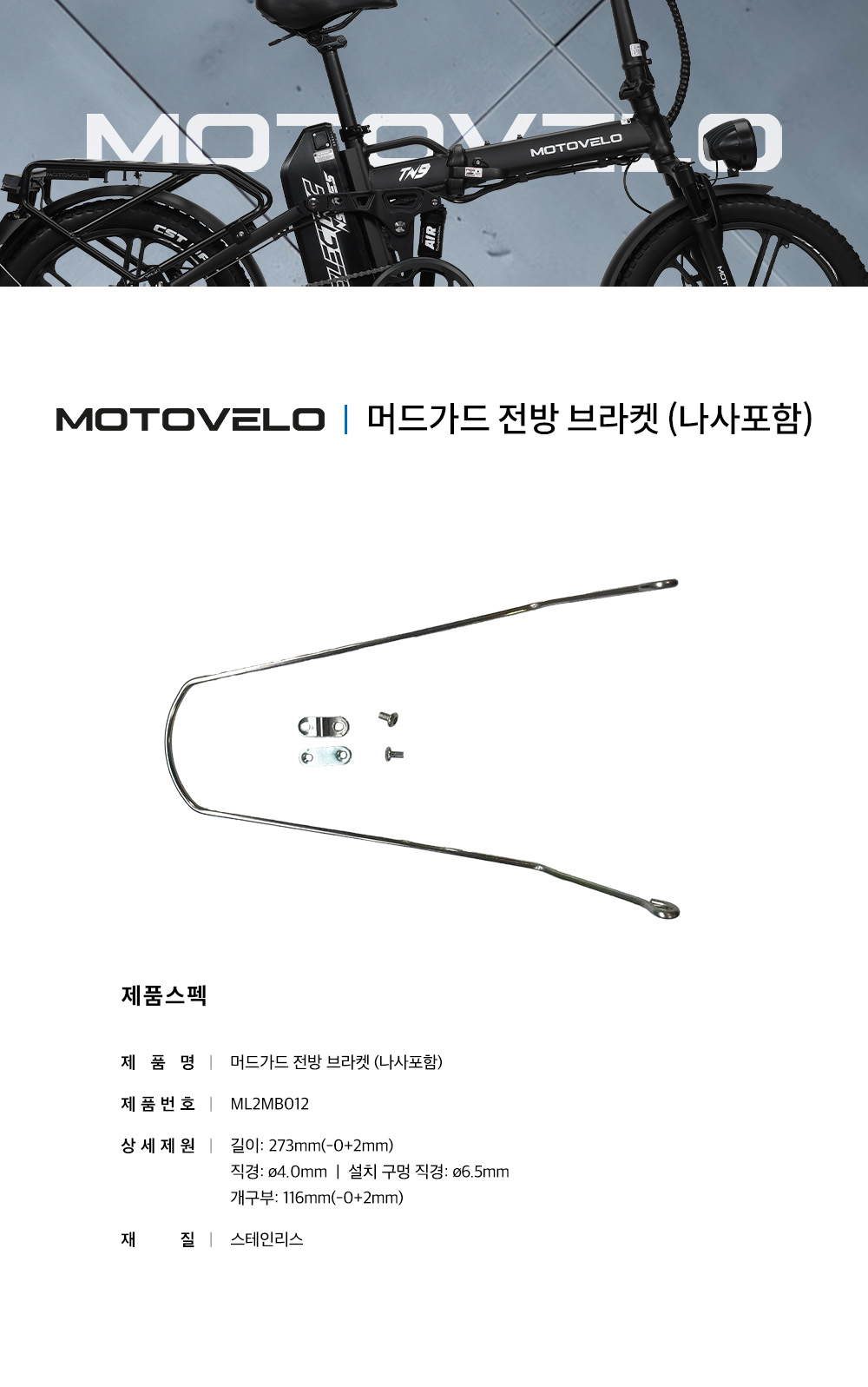 > 모토벨로 TN9 전기자전거 머드가드 전방 브라켓 (나사포함)